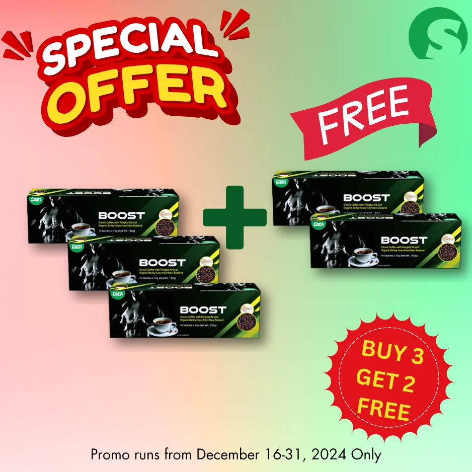 Benefits: Santé Boost Coffee offers the perfect blend of robusta coffee, tongkat ali, and organic barley grass powder, giving you the stamina and energy boost you need throughout the day.
